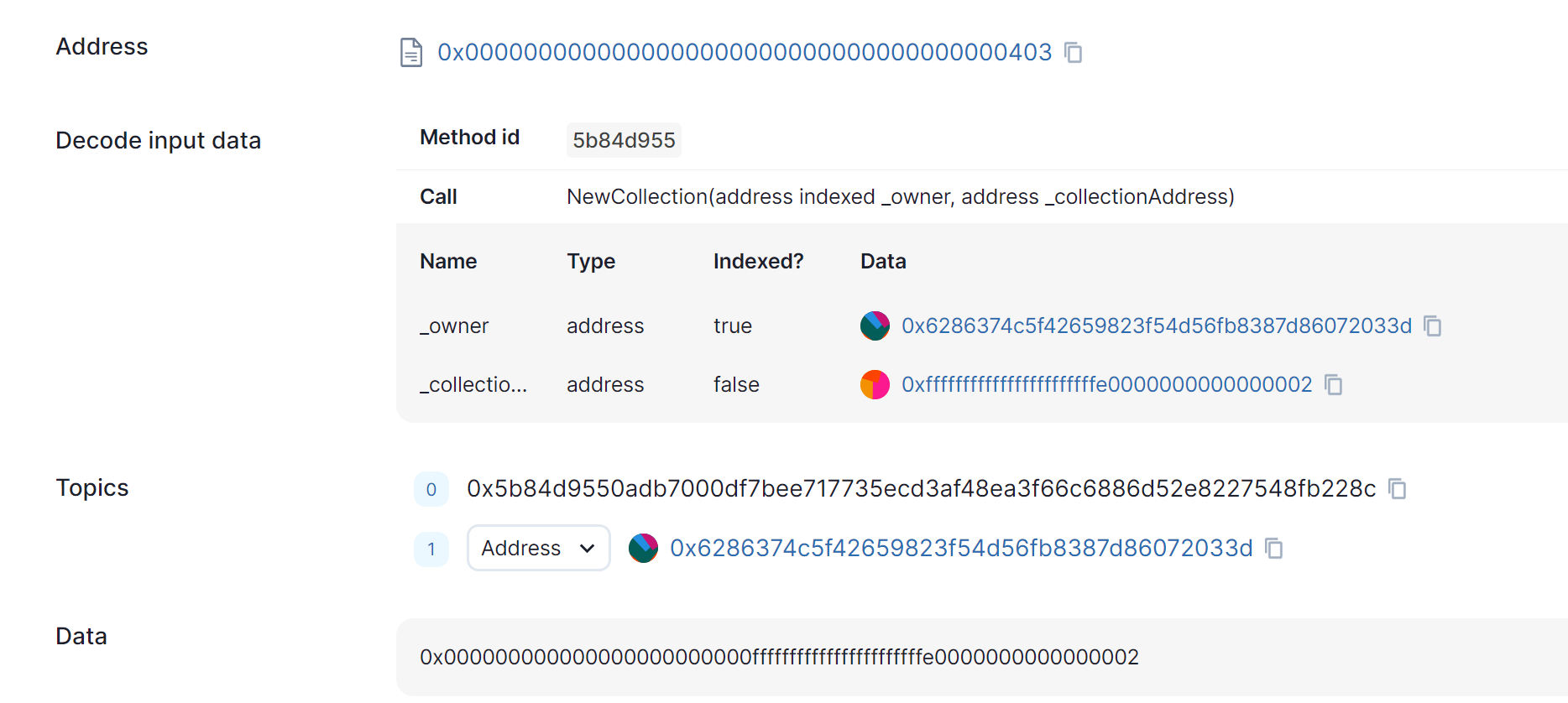 The following createCollection transaction in LAOS Sigma Testnet serves as an example to explore its anatomy, as well as the event it emitted, which includes the owner and the collection address.